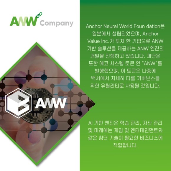 ANW 앵커뉴럴월드의 본신은 Anchor Value 앵커밸류는 일본 도쿄에 본사를 두고 한국과 일본의 AI기술 전문가들의 기술력을 모아 차세대 AI기술개발업체로 현재 다양한 AI기반 인공지능사업을 진출도 하였답니다.