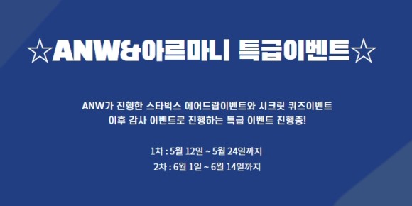 ANW가 진행한 스타벅스 에어드랍이벤트와 시크릿 퀴즈이벤트에 정말 많은 분들의 응원과 참여가 있어서 이어서 ANW에서는 특급 이벤트를 진행한다고 합니다.